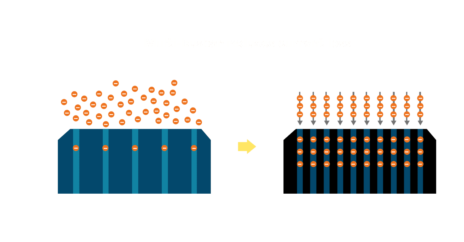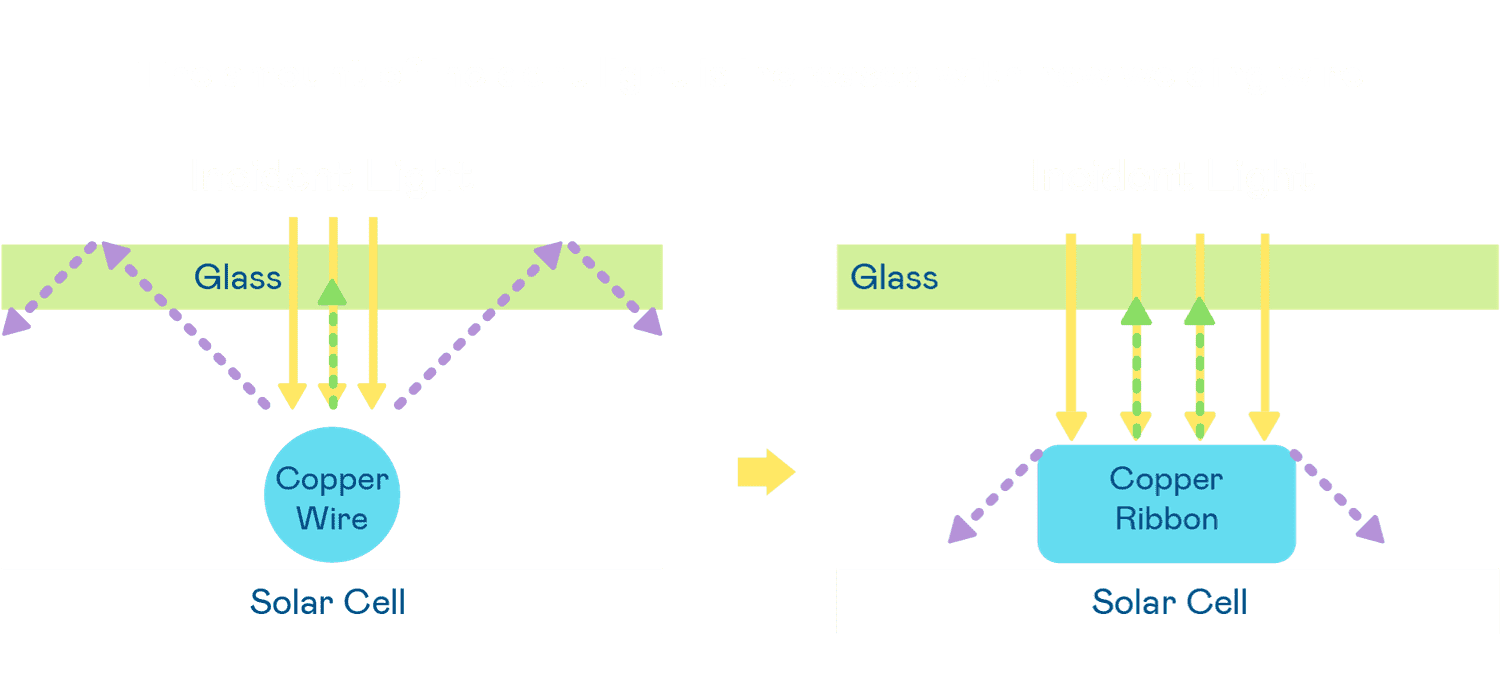 • 电池使用多条铜导线 (Copper wire) 于电池片上形成较短的电流路径,,,,提高电流收集效率,,采用圆形设计的铜导线较传统扁平式的铜焊带 (Ribbon),,,可增加入射至电池的光线量。。