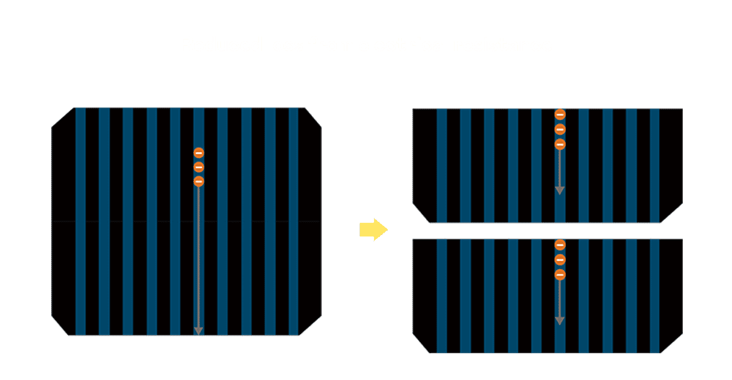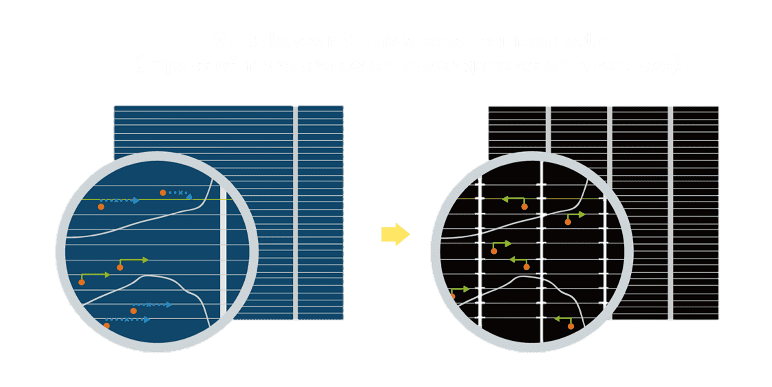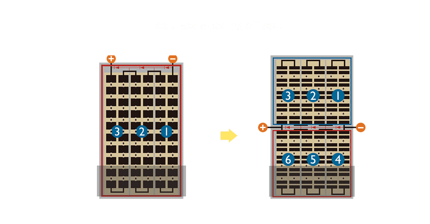 • 结合半切电池,,降低遮阴影响、、、、提升模组抗隐裂能力、、并减少电阻损耗,,,进一步提升模组发电效能。。。。